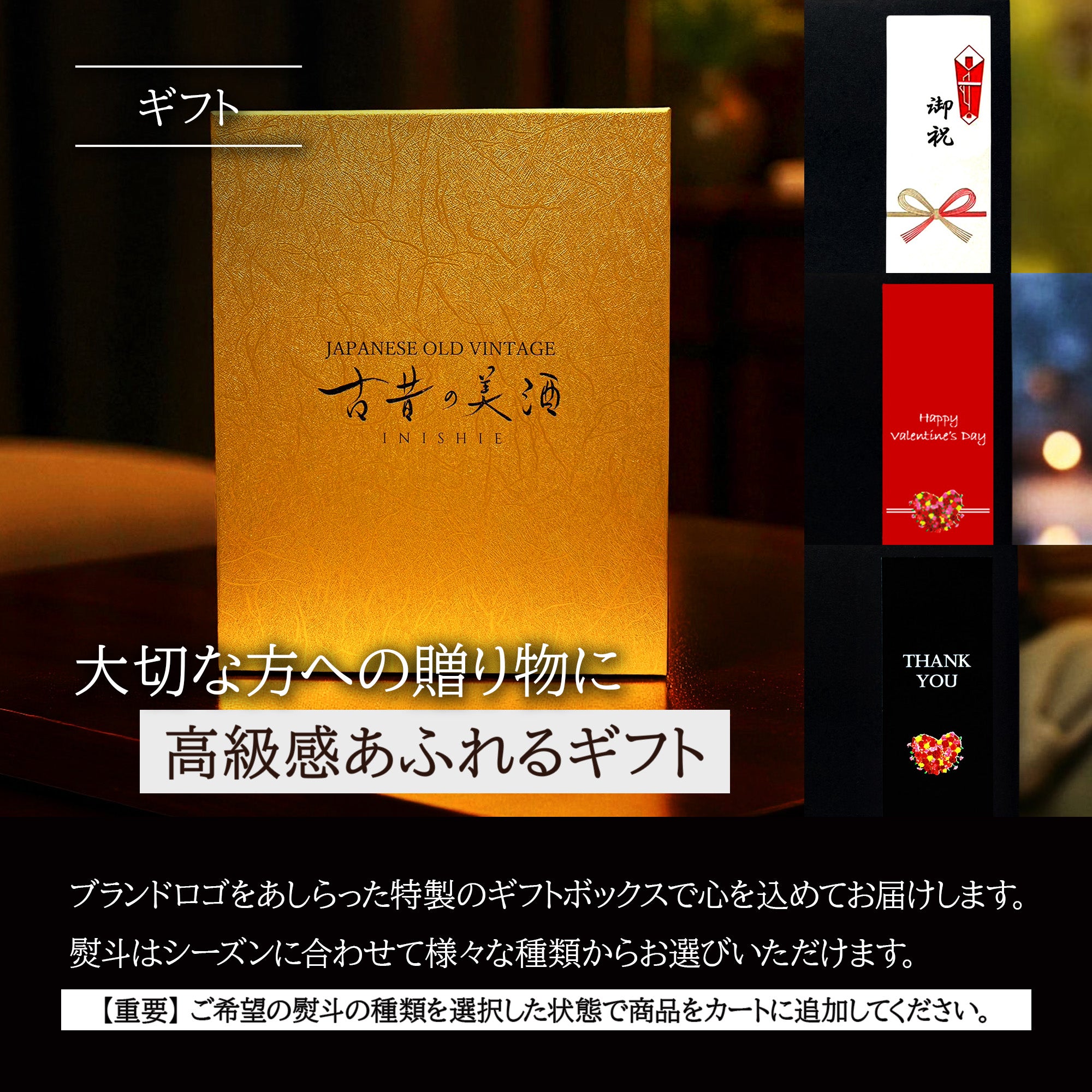 当ブランド特製の高級感漂う国産化粧箱に加え、各種熨斗オプションを承っております。また、はじめての方にも古酒をお楽しみいただけるよう商品紹介カードも付属しています。