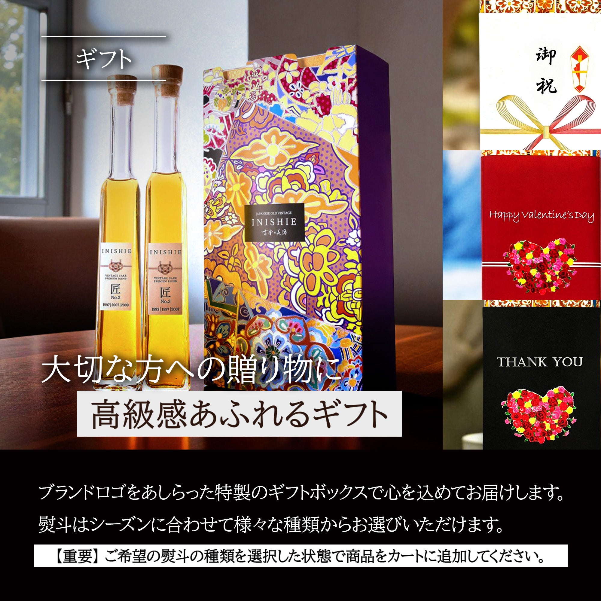 当ブランド特製の高級感漂う国産化粧箱に加え、各種熨斗オプションを承っております。また、はじめての方にも古酒をお楽しみいただけるよう商品紹介カードも付属しています。