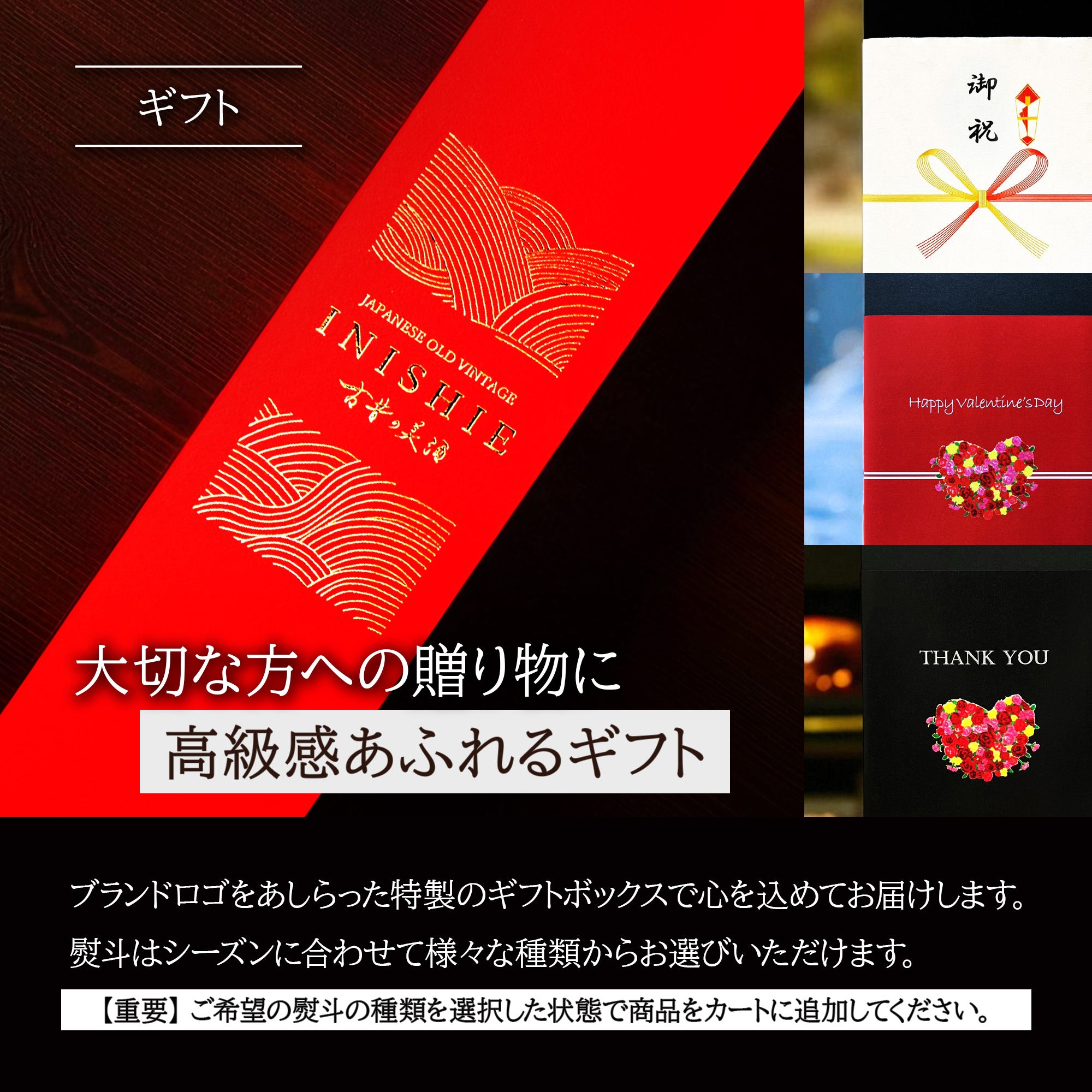 In addition to our brand's specially made, luxurious Japanese presentation box, we also offer various gift wrapping options. A product introduction card is also included so that even first-time customers can enjoy our aged sake.
