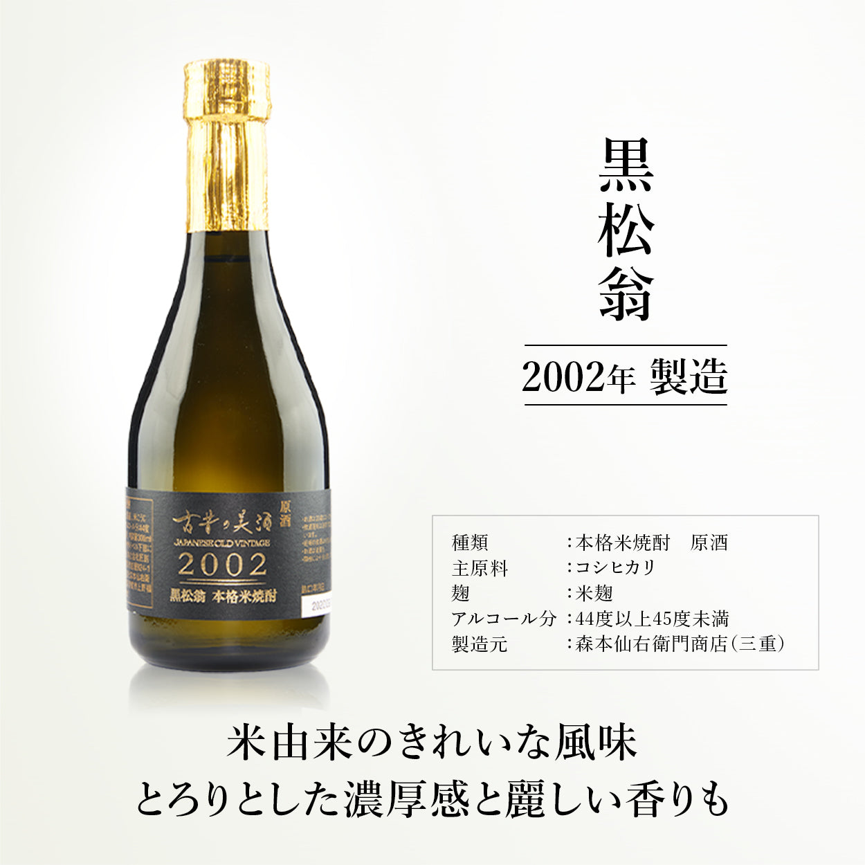 Shochu de riz authentique. Matière première principale : Koshihikari. Koji : Malt de riz. Teneur en alcool : 44% à 45%.