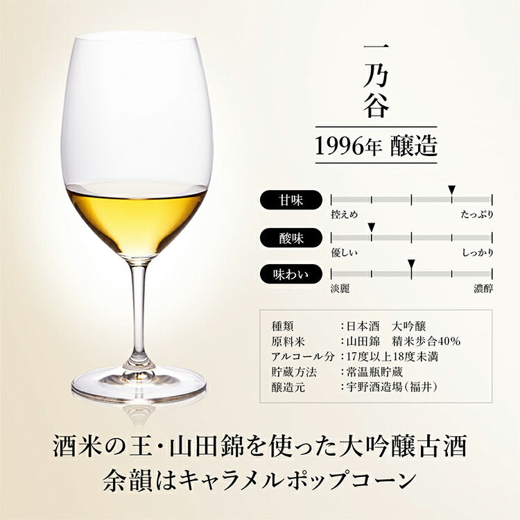 Ce saké Junmai Ginjo est élaboré à partir de riz Yamadanishiki et Gohyakumangoku de la préfecture de Fukui, poli à 55% et vieilli pendant 15 ans à une température constante de 13°C. Il a un arôme très doux qui combine le parfum doux et magnifique des poires mûres avec le parfum rafraîchissant des épices comme la cardamome.